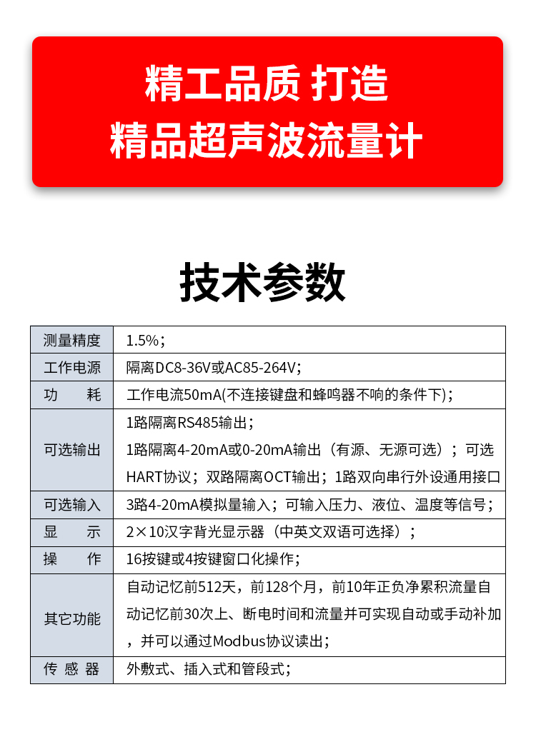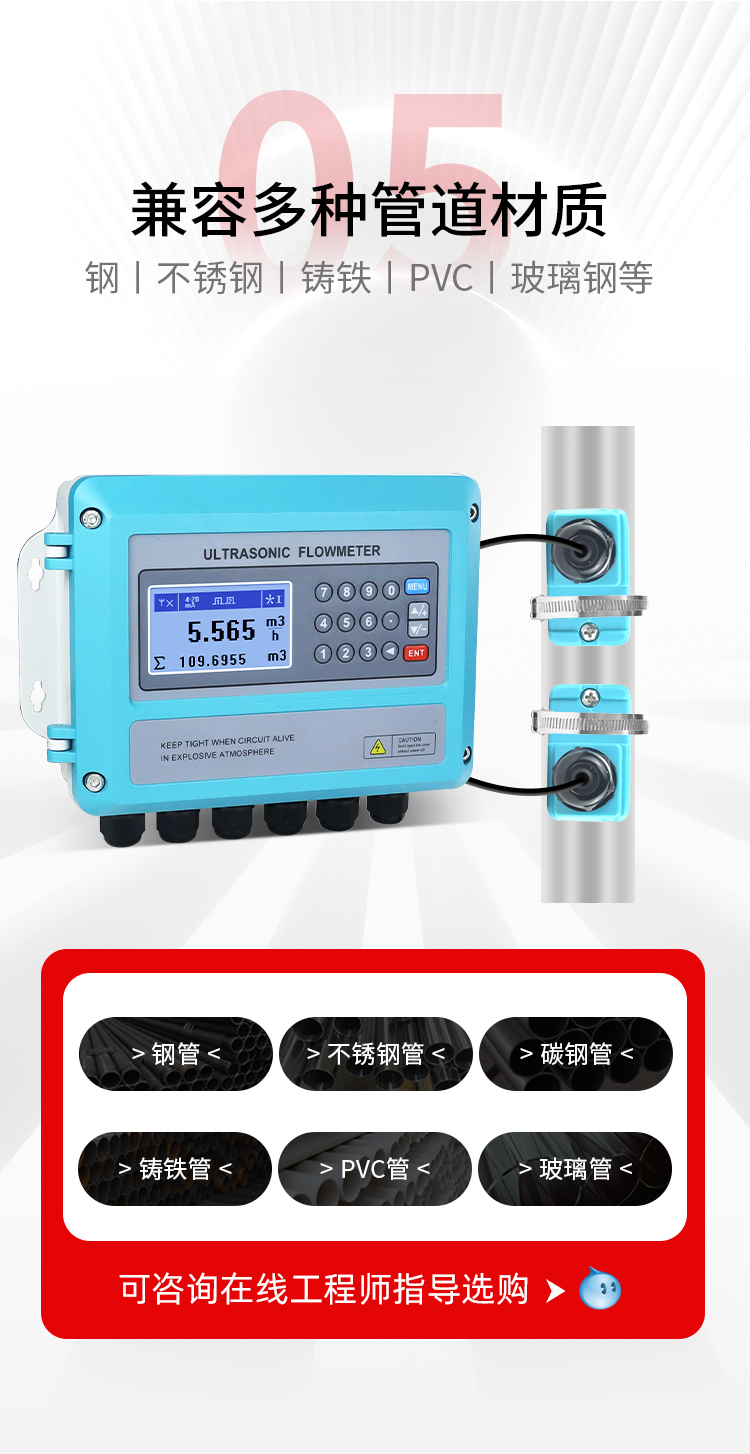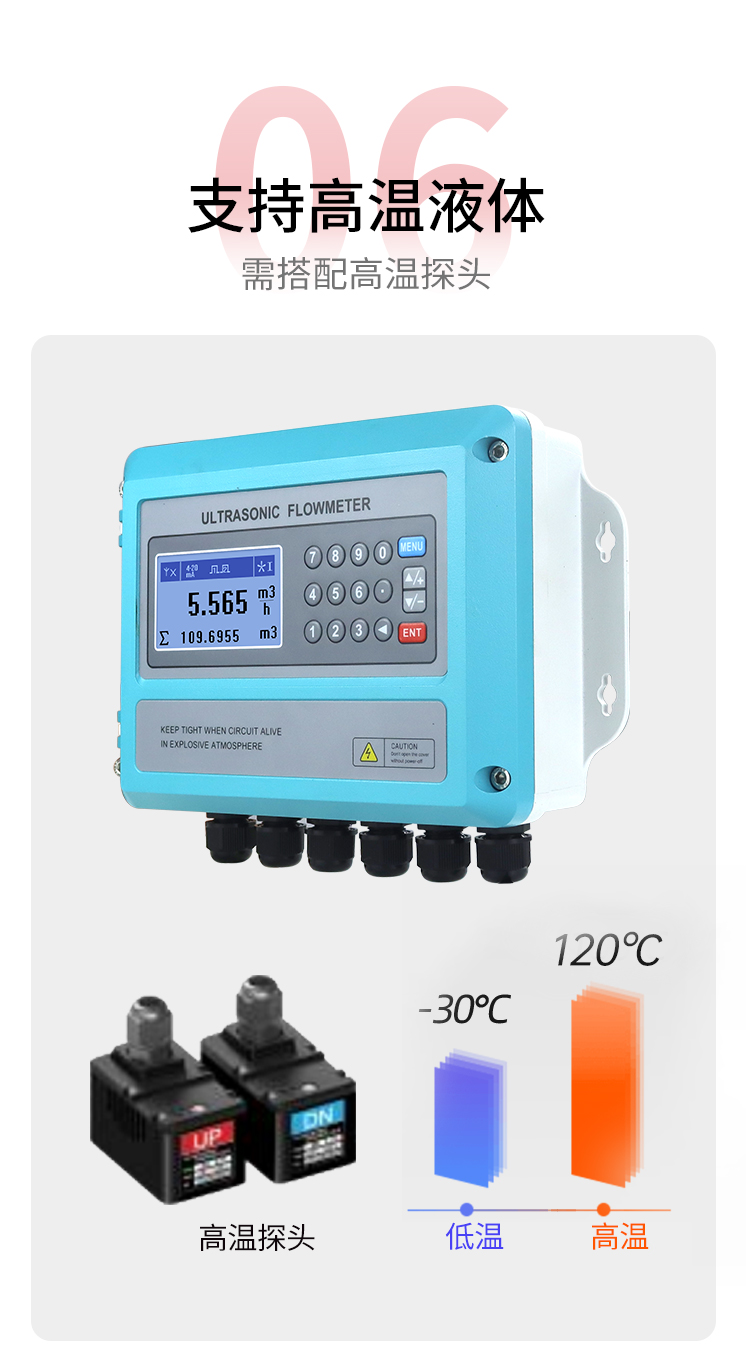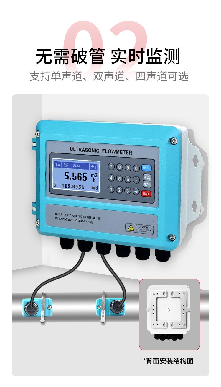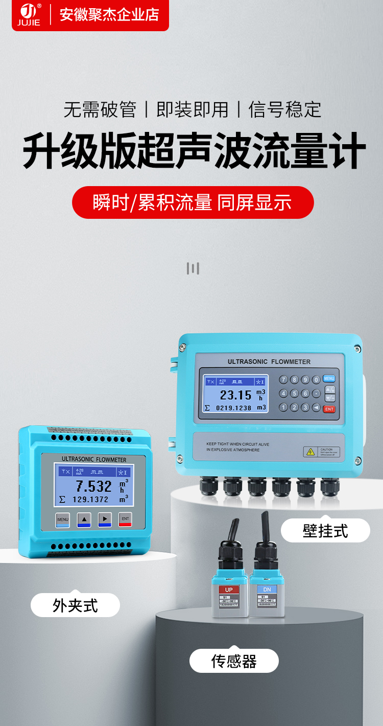 安徽聚杰超声波流量计,采用壁挂固定式设计,无需破管即可实现稳定测量,安装便捷且不影响管路运行。支持 4~20mA 信号输出与 RS485 通讯,适配多样化工业控制与数据采集需求。