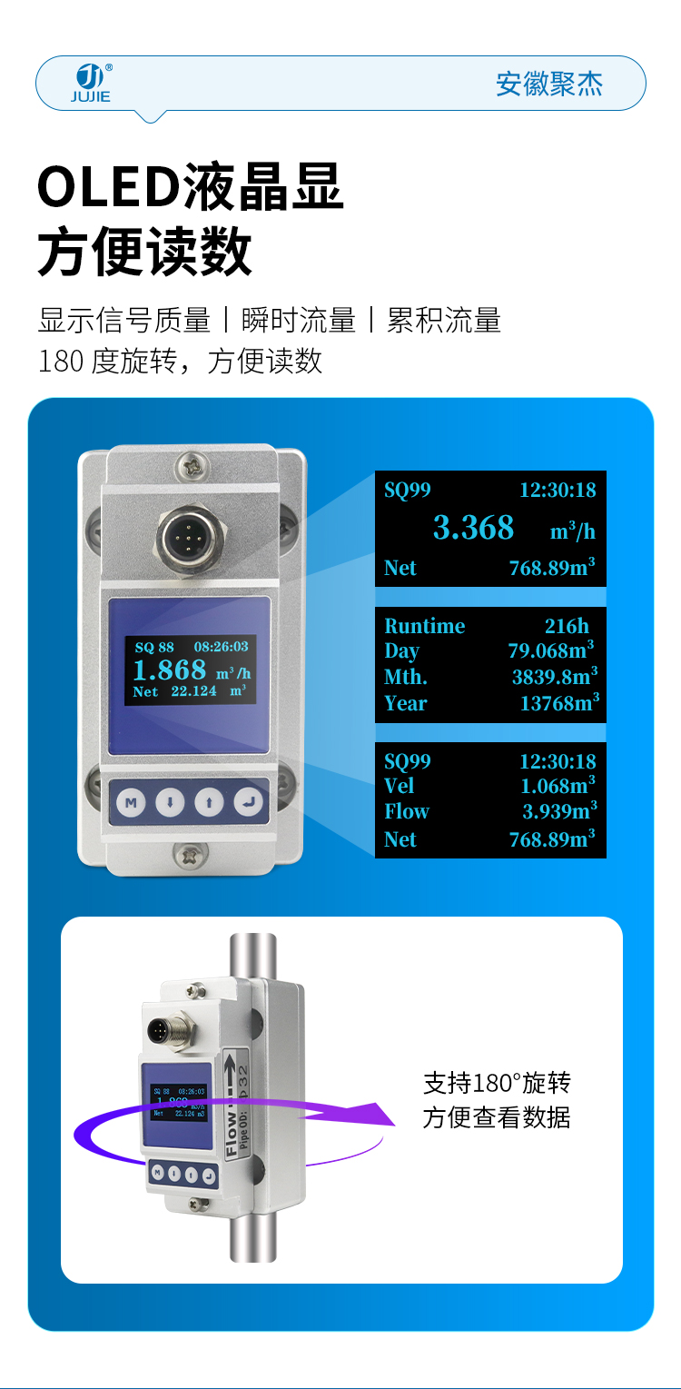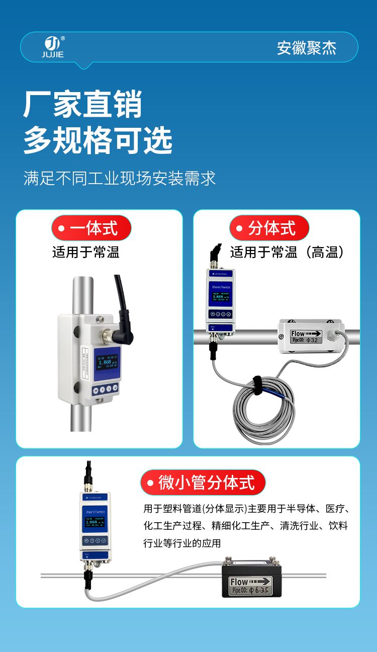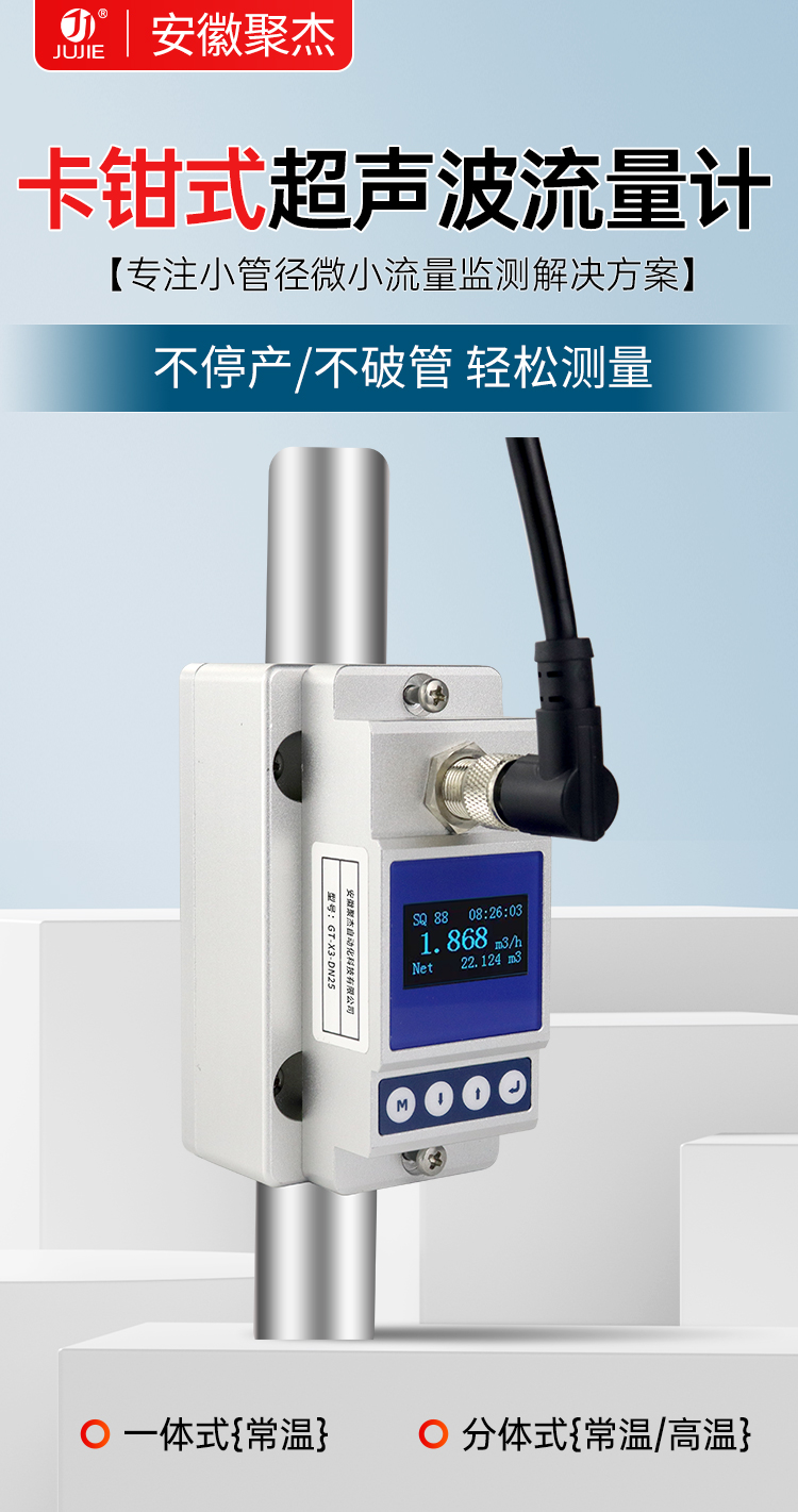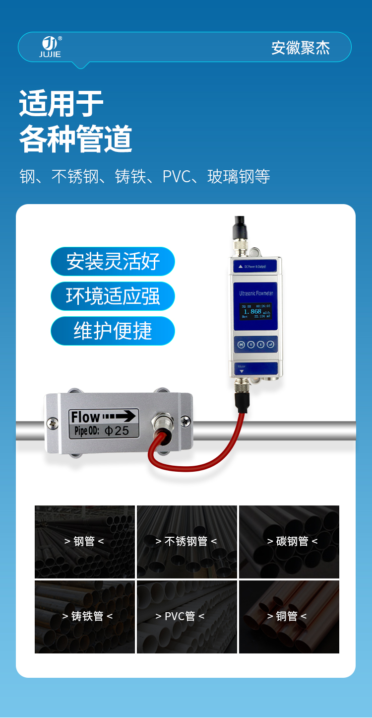 安徽聚杰卡钳式超声波流量计,采用外扣式安装设计,不破管道即可轻松测量,尤其适合微小流量场景,支持按需定制。支持 4~20mA 模拟输出、OCT 报警输出及 RS485(Modbus 协议)通讯,适配多样化工业控制需求。可适配水、海水、油、化学品等介质,兼容不锈钢、碳钢、塑料管等多种管材。