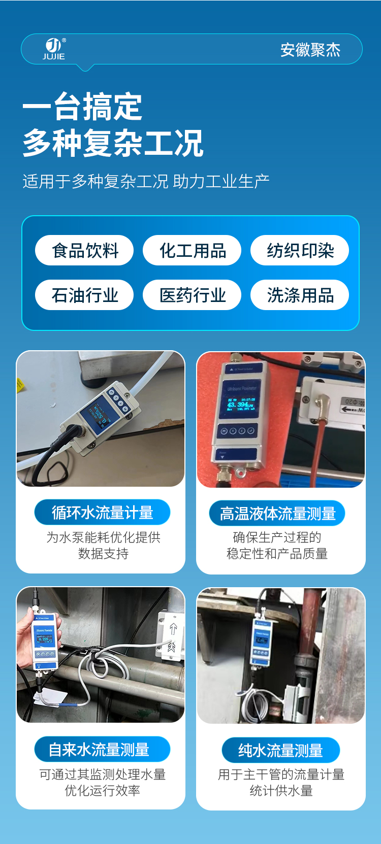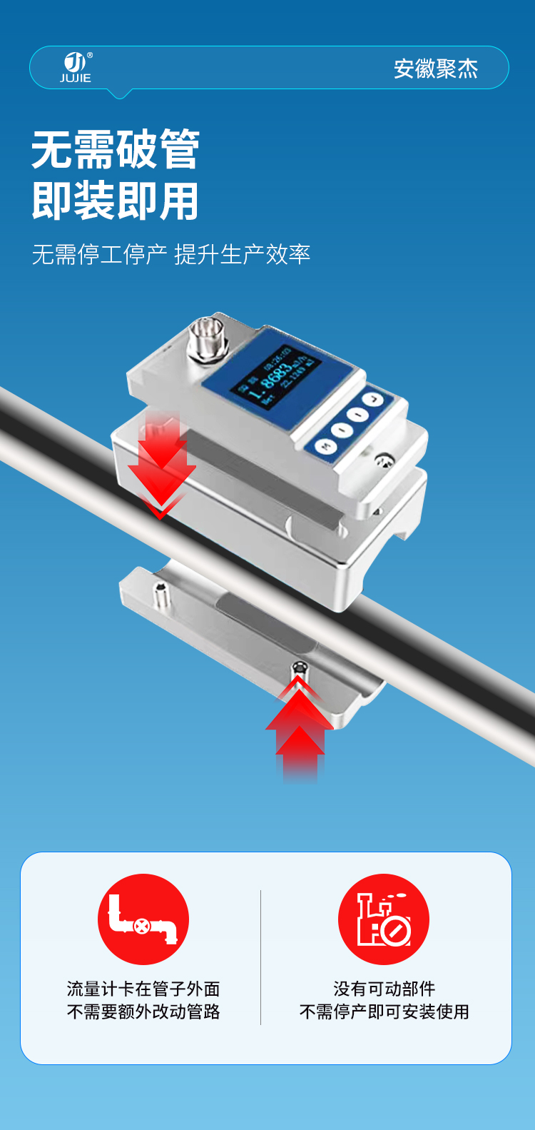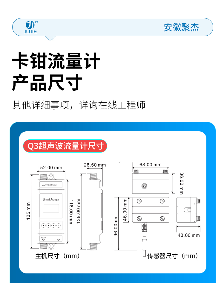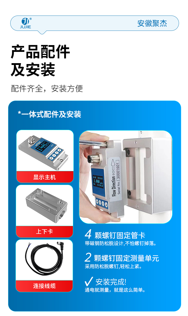 安徽聚杰卡钳式超声波流量计,采用外扣式安装设计,不破管道即可轻松测量,尤其适合微小流量场景,支持按需定制。支持 4~20mA 模拟输出、OCT 报警输出及 RS485(Modbus 协议)通讯,适配多样化工业控制需求。可适配水、海水、油、化学品等介质,兼容不锈钢、碳钢、塑料管等多种管材。