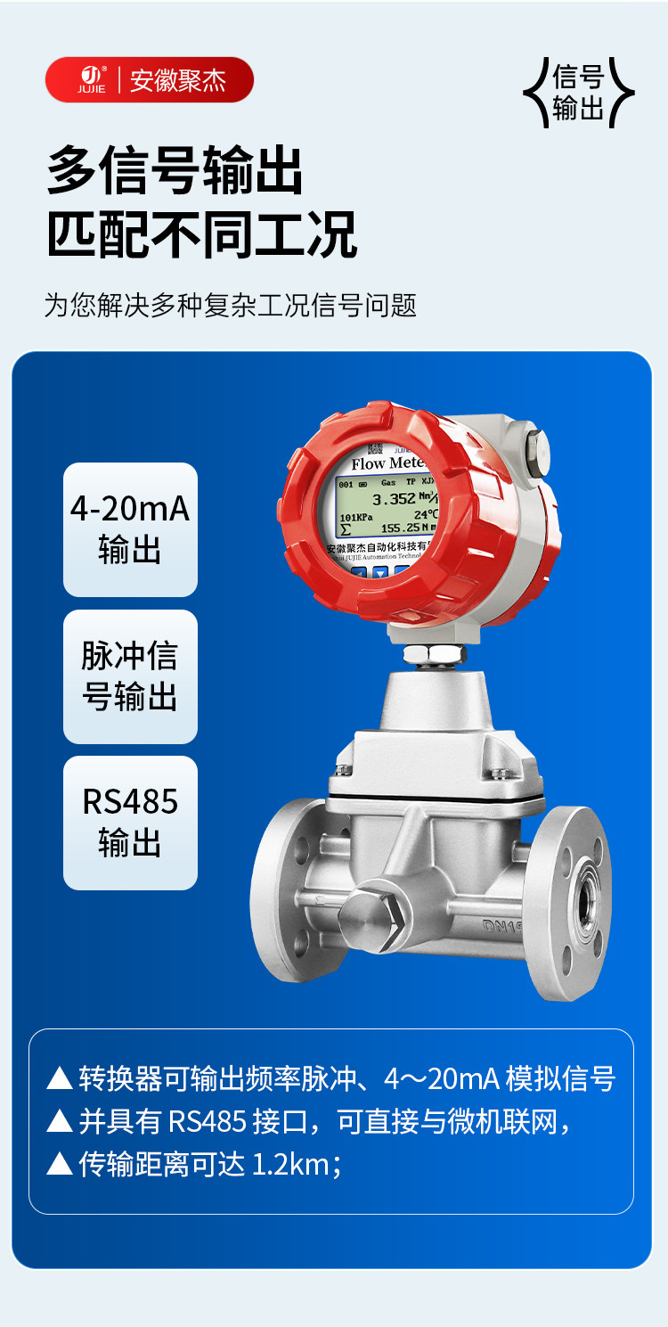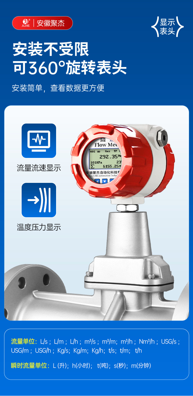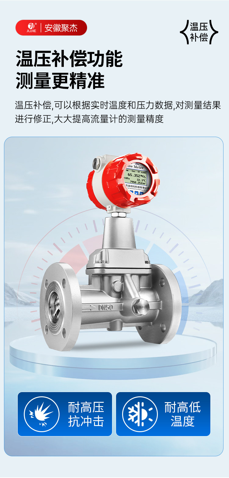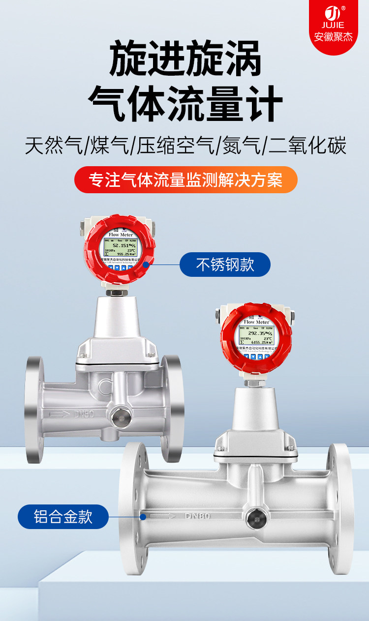 安徽聚杰旋进旋涡流量计,专为气体流量计量打造,自带温压补偿功能,可精准计量压缩空气、氢气、氮气、煤气、天然气等多种气体。支持 4-20mA、脉冲信号、RS485 等多信号输出,可灵活匹配不同工业工况。采用不锈钢材质与法兰接口,结构坚固耐用,广泛应用于化工、能源、冶金等行业的气体计量场景。