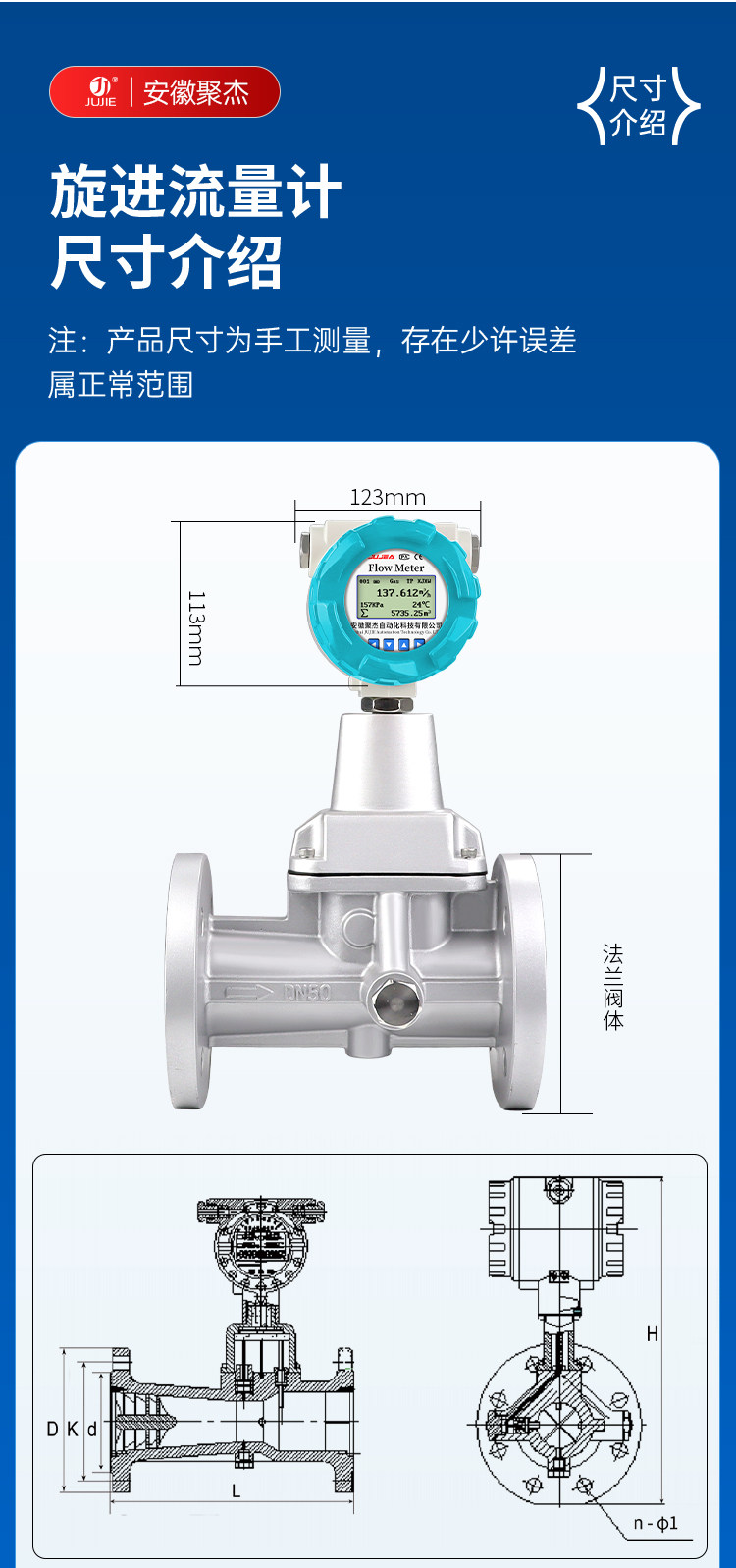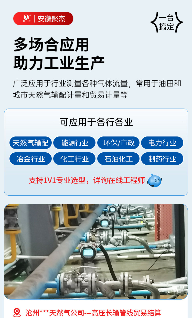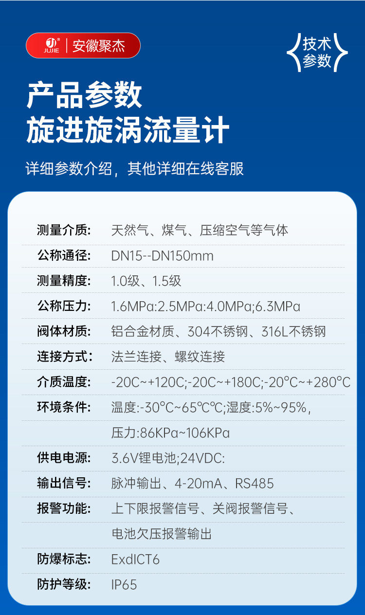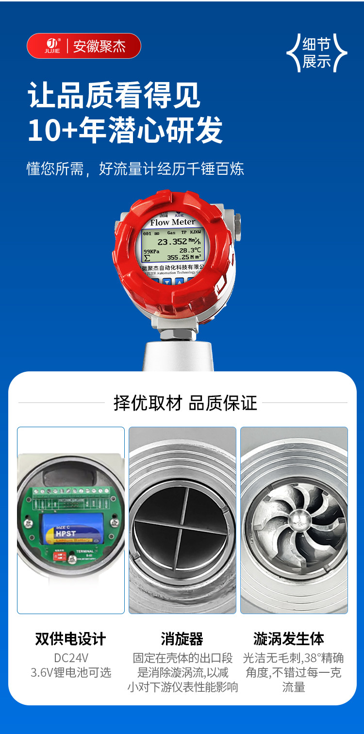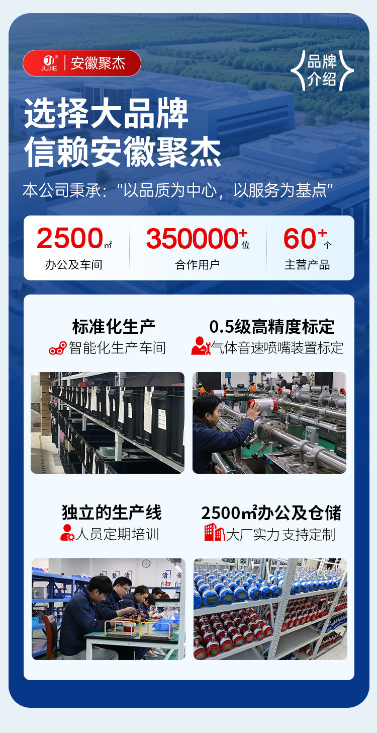 安徽聚杰旋进旋涡流量计,专为气体流量计量打造,自带温压补偿功能,可精准计量压缩空气、氢气、氮气、煤气、天然气等多种气体。支持 4-20mA、脉冲信号、RS485 等多信号输出,可灵活匹配不同工业工况。采用不锈钢材质与法兰接口,结构坚固耐用,广泛应用于化工、能源、冶金等行业的气体计量场景。