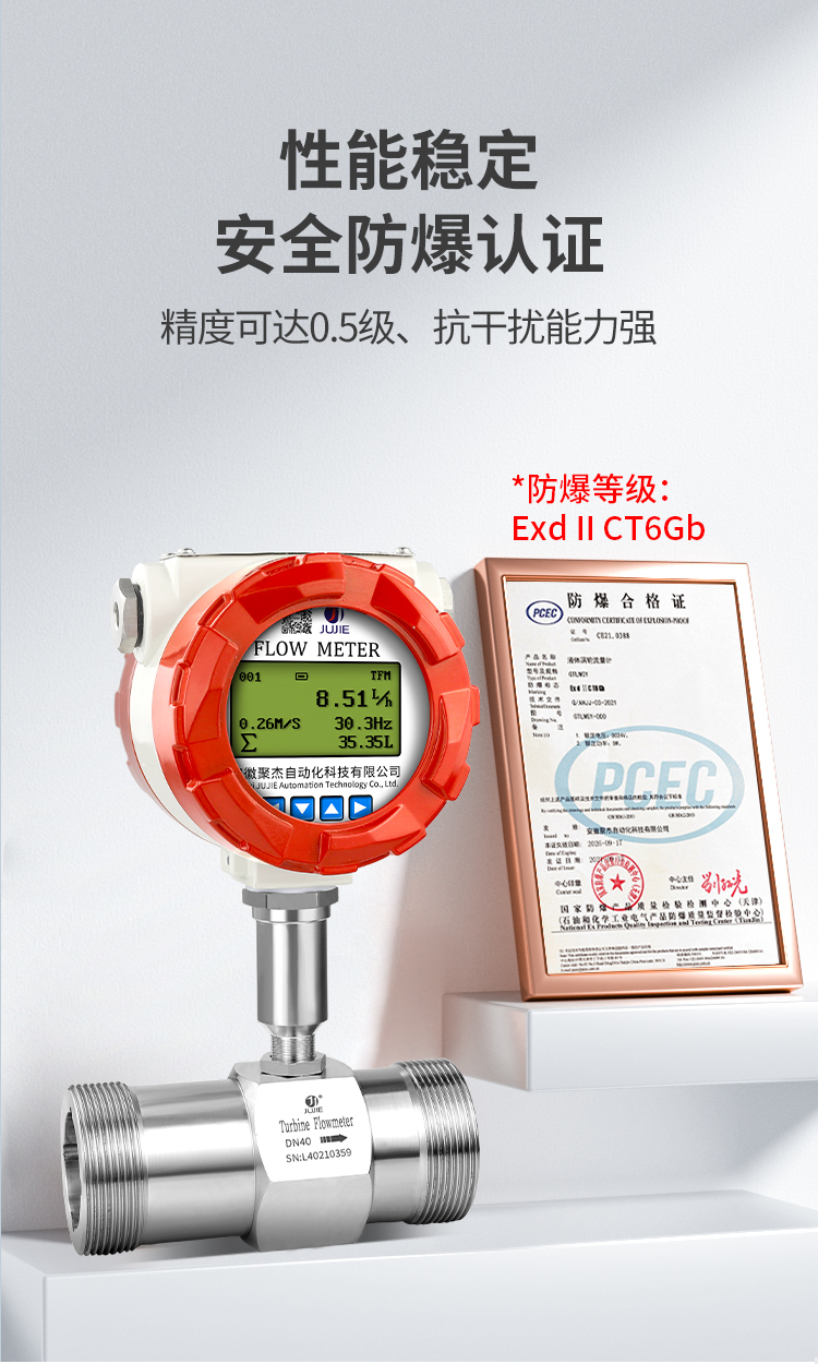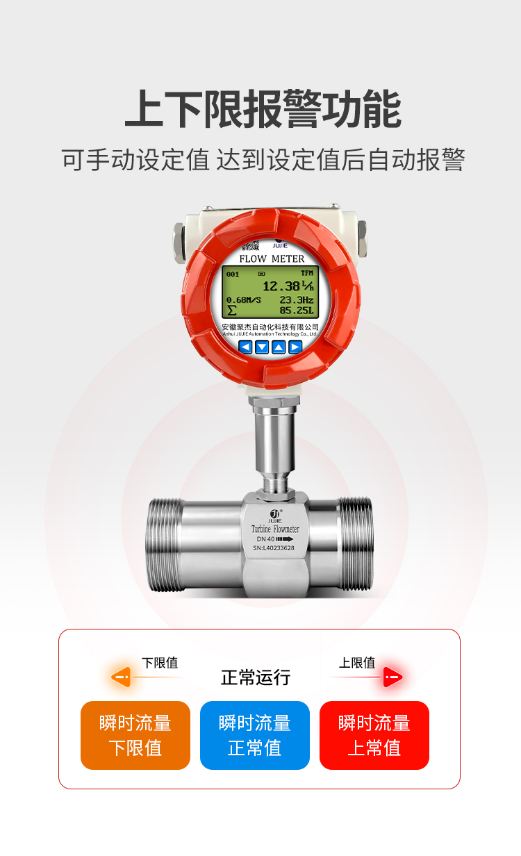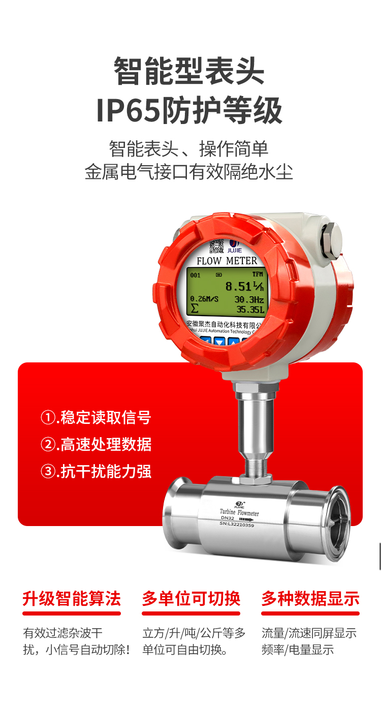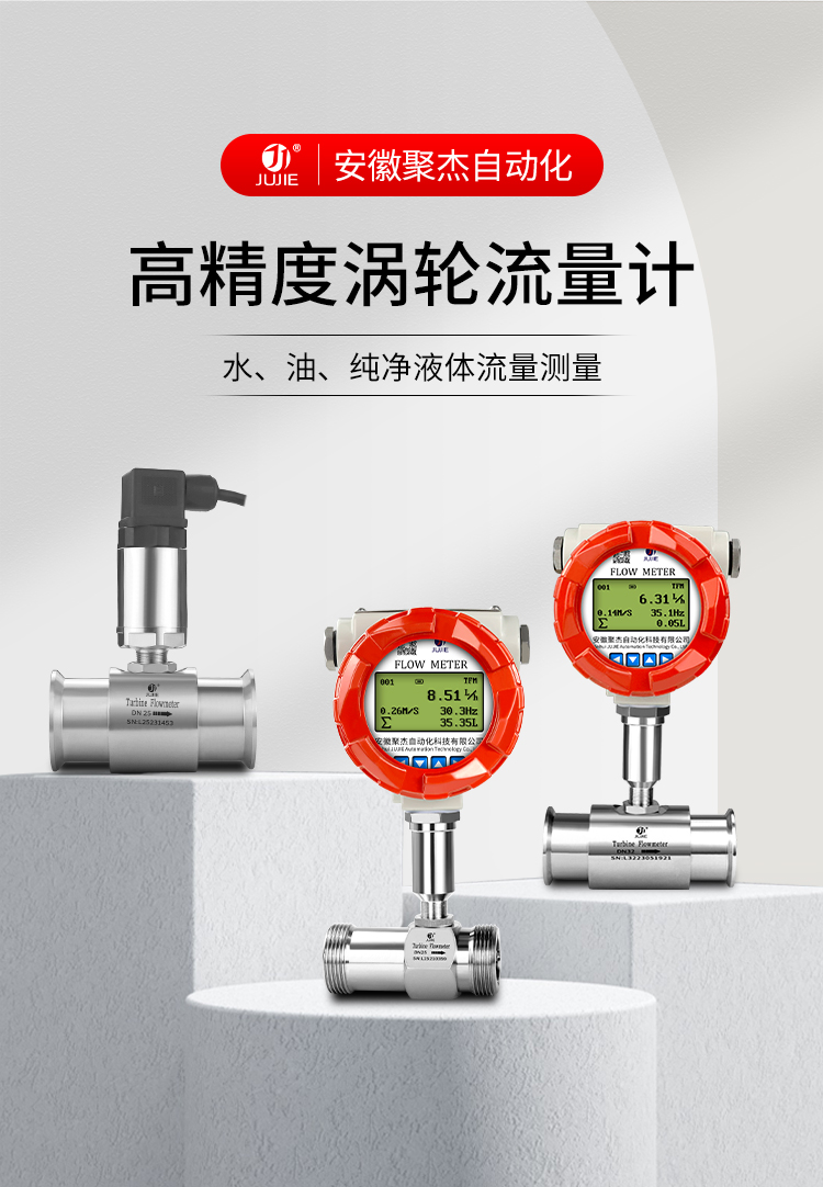 安徽聚杰液体涡轮流量计,可实时显示瞬时流量与累积流量,兼容纯水、自来水、酒精、食用油、牛奶、饮料等多种液体介质。支持脉冲信号、RS485、4-20mA、0-5V、0-10V 等多种输出信号,满足多样化工业控制与数据采集场景。