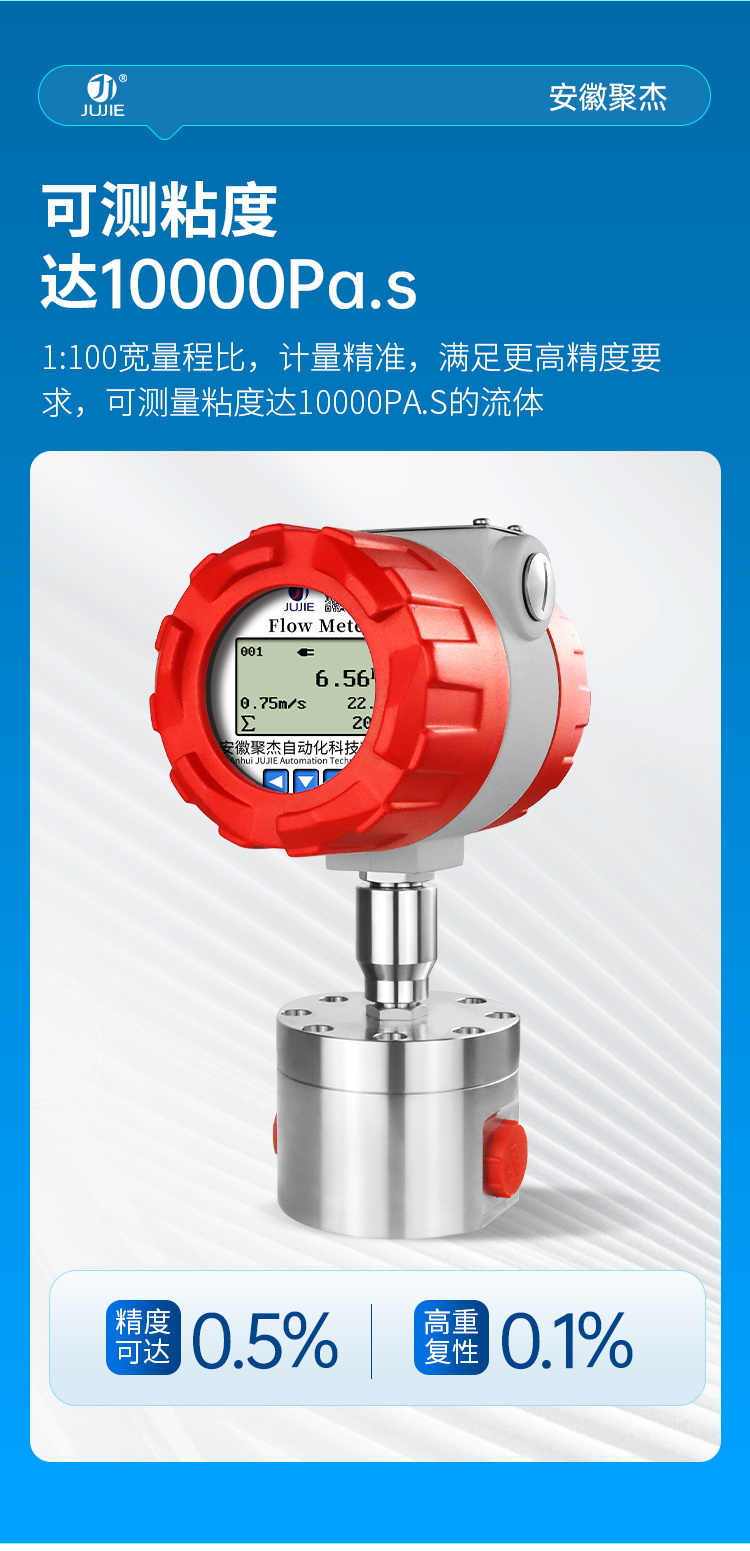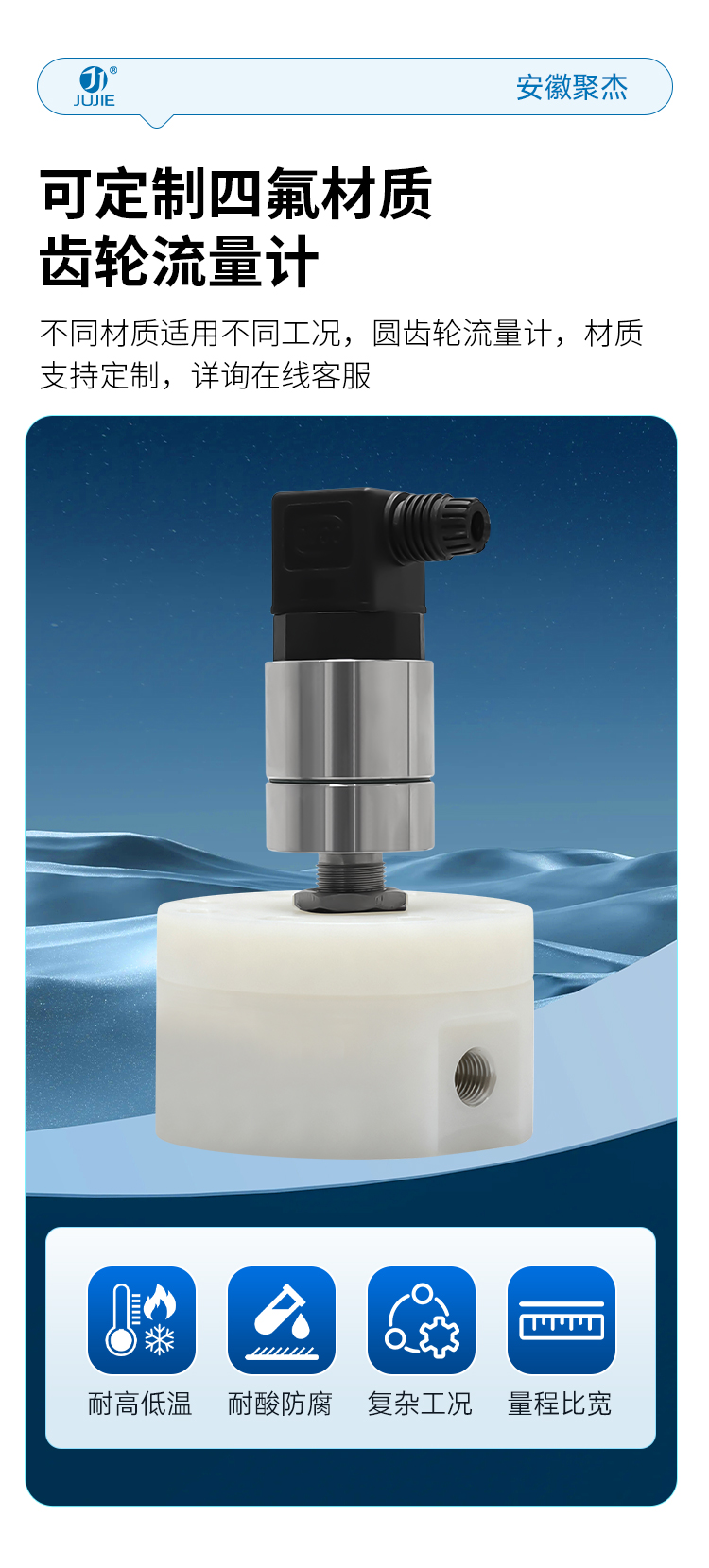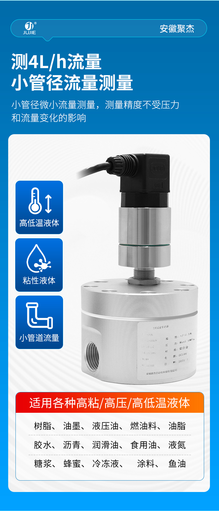 安徽聚杰圆齿轮流量计,专为高温高粘介质计量设计,适配树脂、胶水、油墨、沥青、糖浆、蜂蜜、液氮、冷冻液等多种介质。产品精度达0.5级,支持脉冲信号、4-20mA、RS485等多种输出方式,尤其适合小管径流量测量场景。广泛应用于化工、食品、能源等行业,是高粘流体计量的可靠之选。