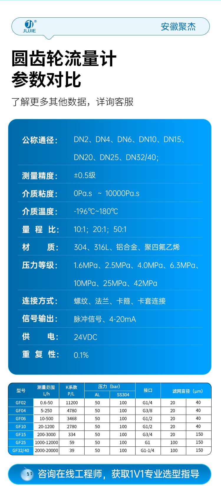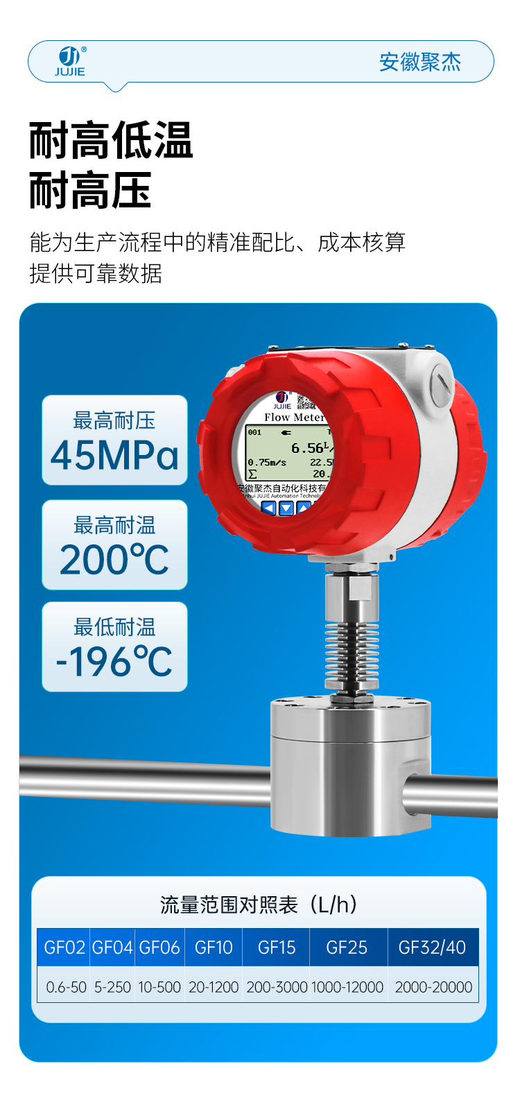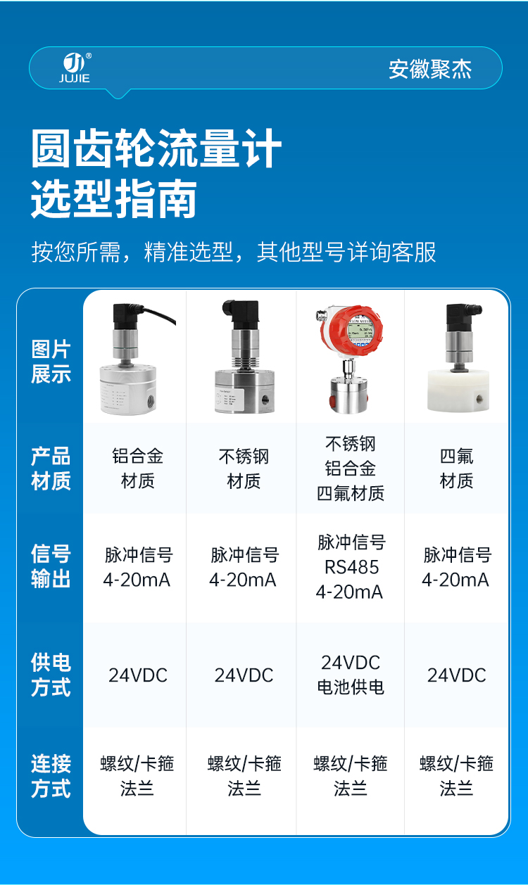 安徽聚杰圆齿轮流量计,专为高温高粘介质计量设计,适配树脂、胶水、油墨、沥青、糖浆、蜂蜜、液氮、冷冻液等多种介质。产品精度达0.5级,支持脉冲信号、4-20mA、RS485等多种输出方式,尤其适合小管径流量测量场景。广泛应用于化工、食品、能源等行业,是高粘流体计量的可靠之选。