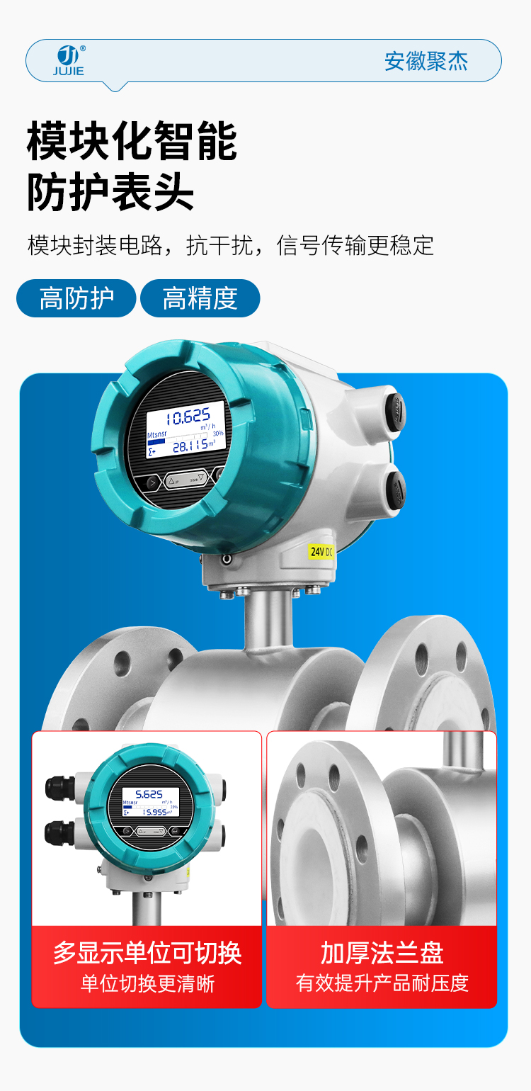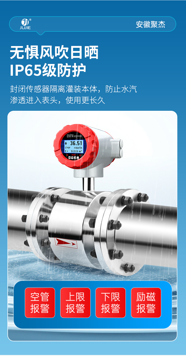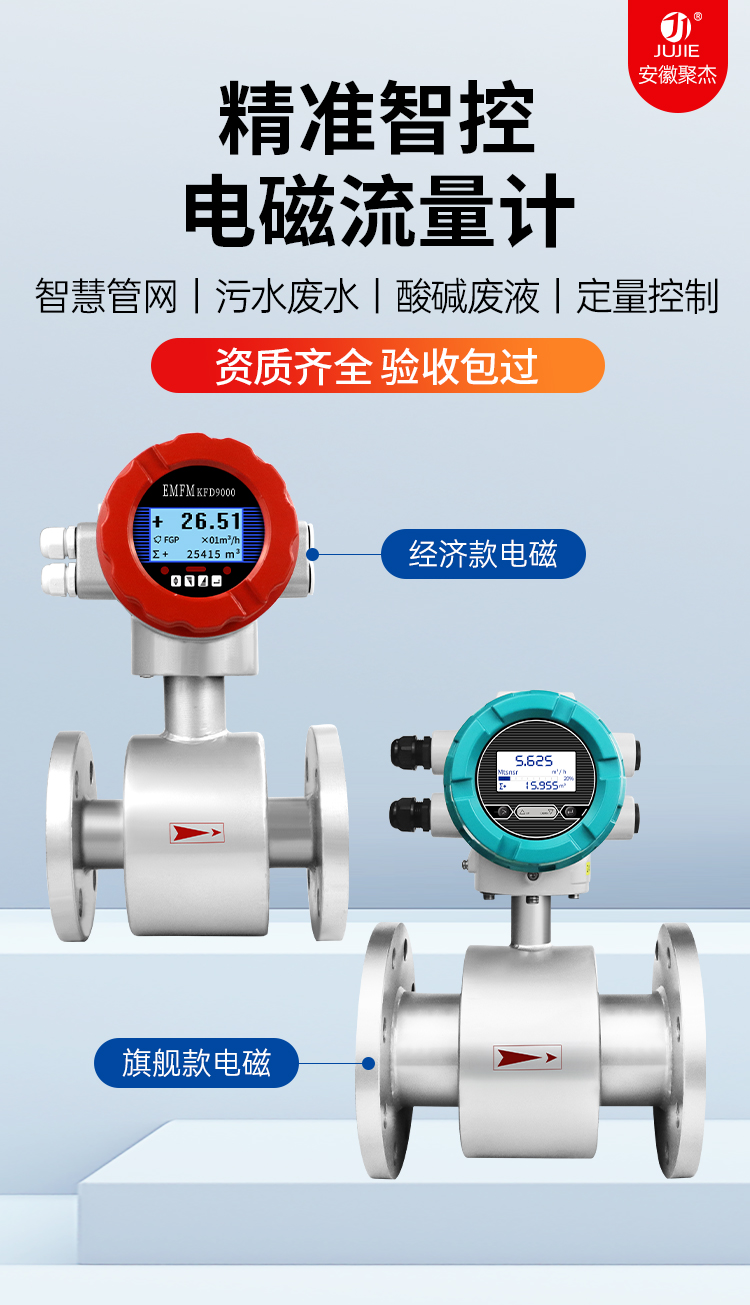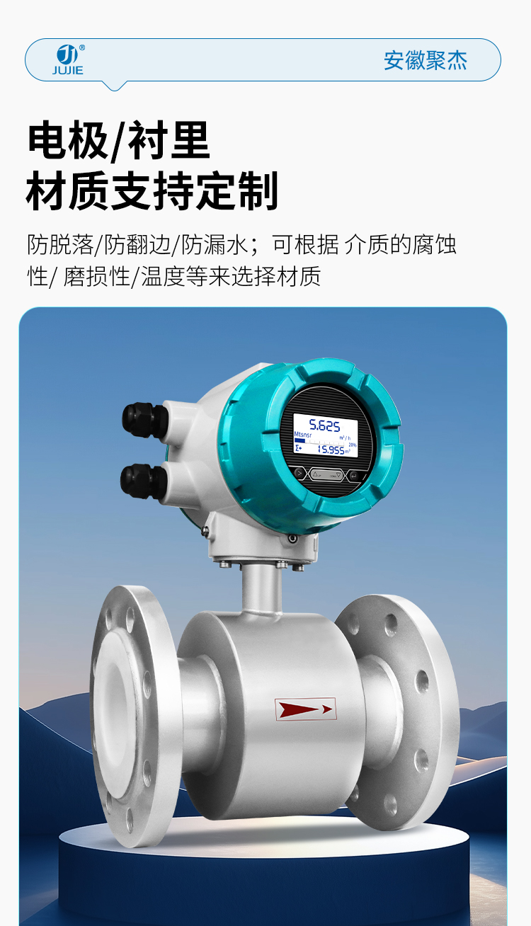 安徽聚杰电磁流量计,设备支持瞬时流量与累积流量双显示,可实时监测污水、河水、清水及各类导电酸碱溶液等多种介质。产品配备脉冲信号、4-20mA 信号输出及 RS485 通讯功能,适配多元工业工况。