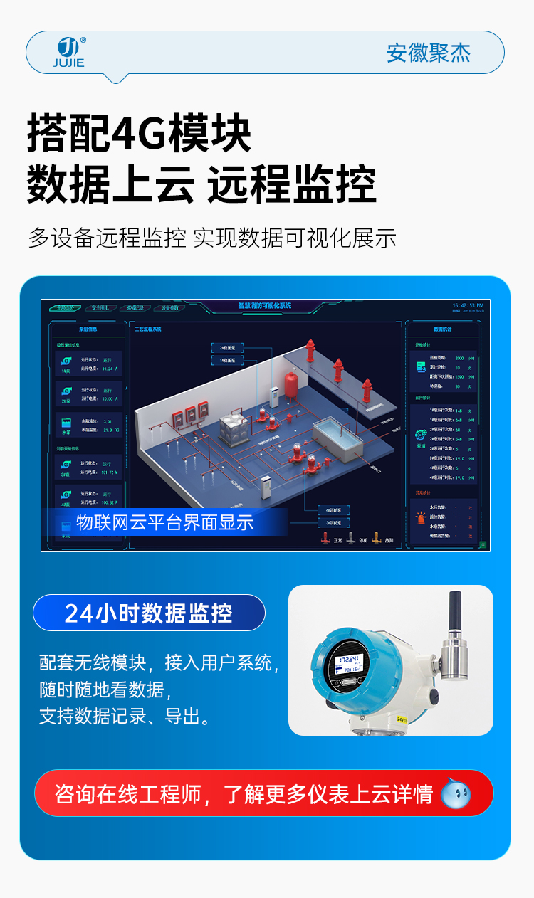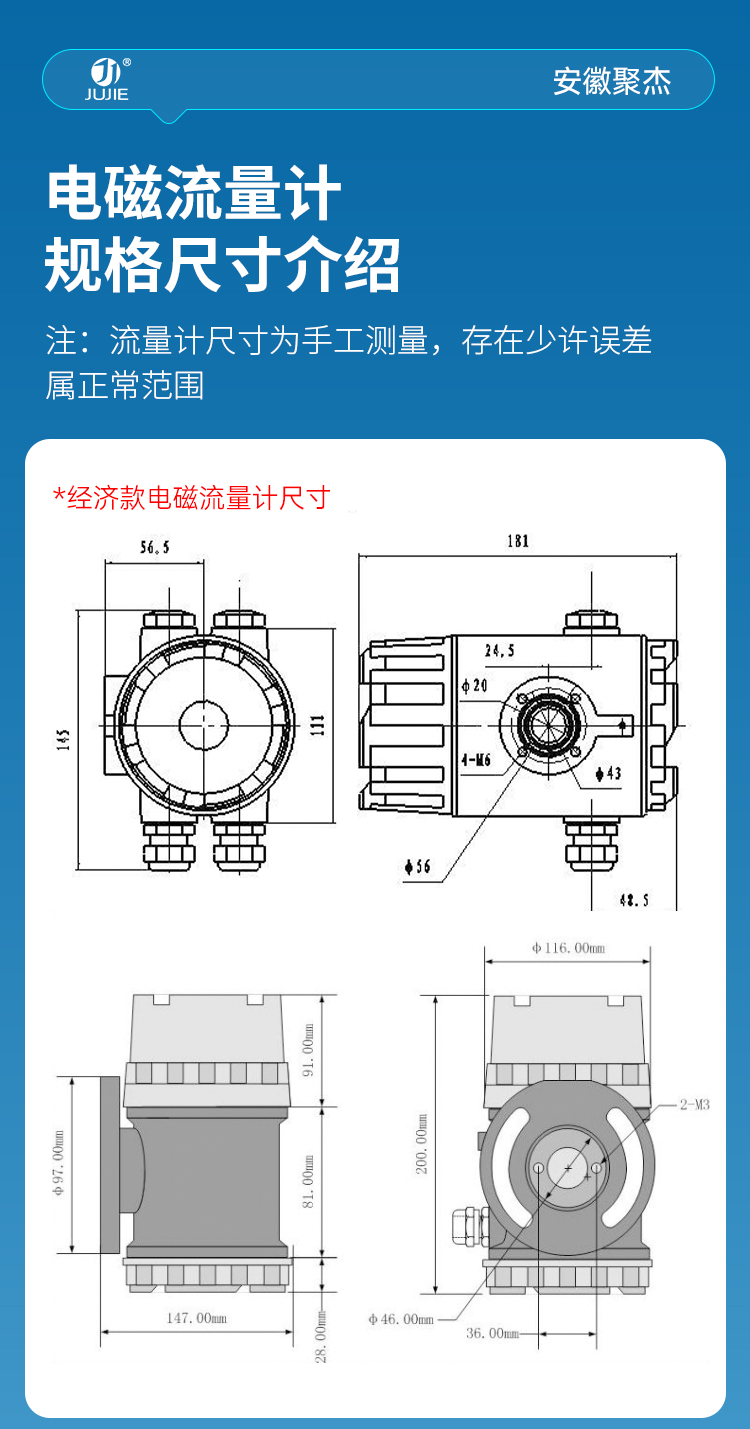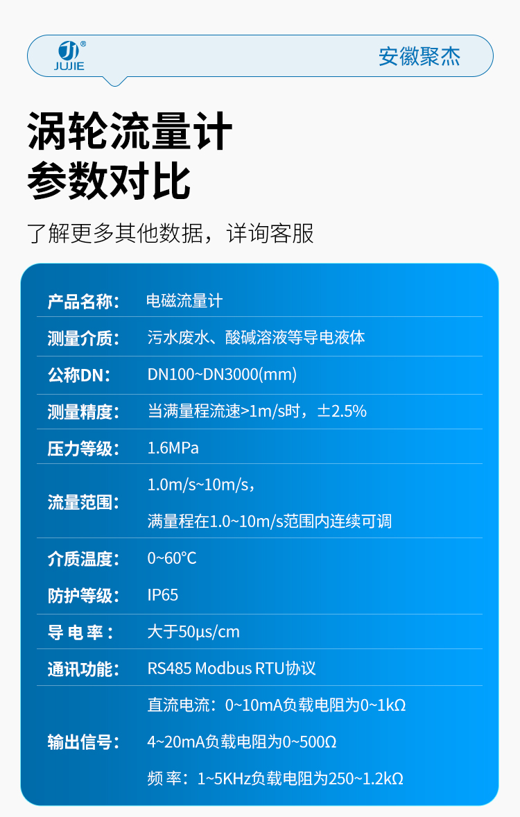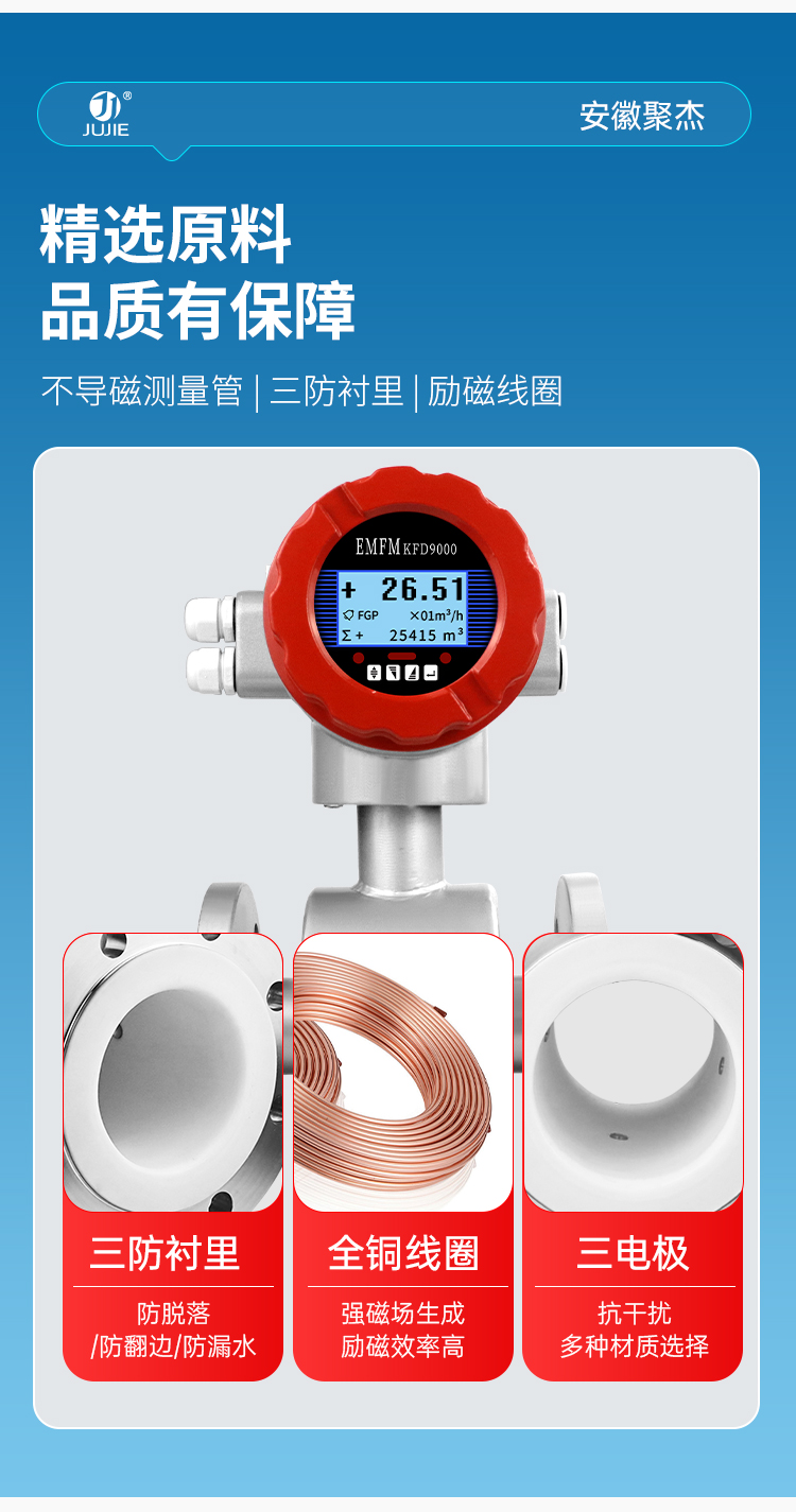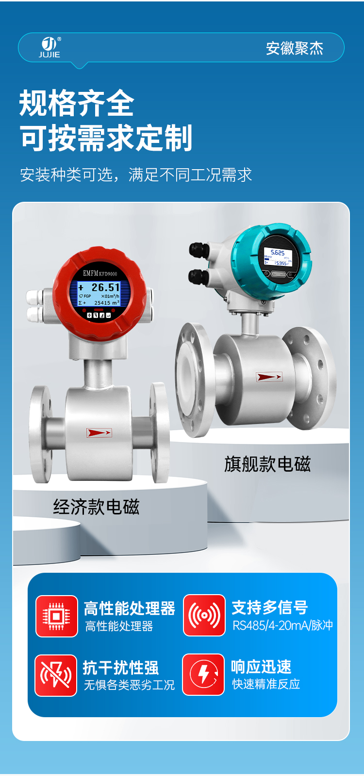 安徽聚杰电磁流量计,设备支持瞬时流量与累积流量双显示,可实时监测污水、河水、清水及各类导电酸碱溶液等多种介质。产品配备脉冲信号、4-20mA 信号输出及 RS485 通讯功能,适配多元工业工况。